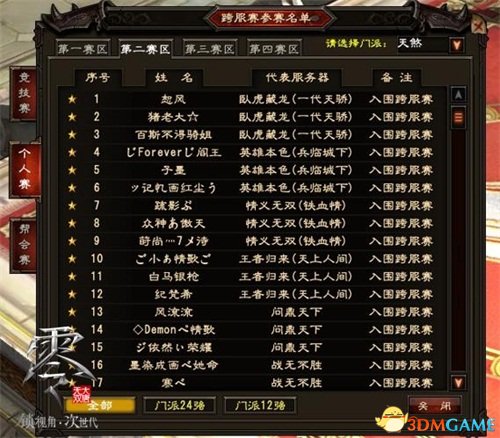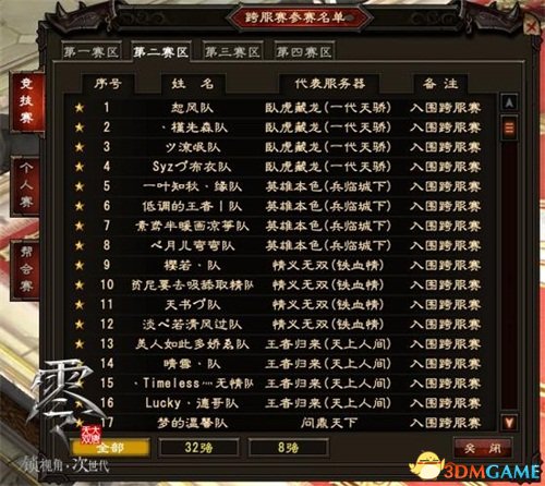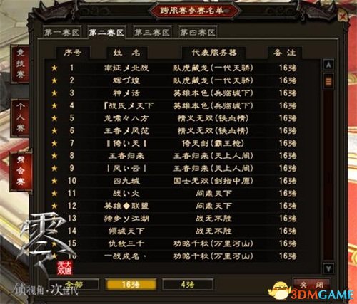 At present, teams and individuals who are full of warfare, Crouching Tiger, Hidden Dragon (Generation of Tianjiao), Famous Famous (Battle Rivers and Lakes), and unparalleled (laughing at Fengyun) and other major servers have been shortlisted for competition and personal competitions.The top 16 list has also been born.The wonderful game is getting worse, and the warriors have opened the onlookers mode to cheer!
