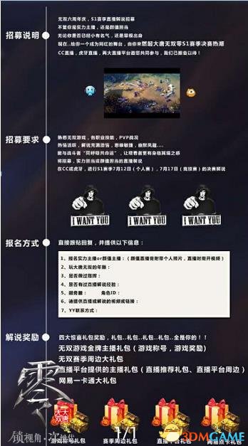 Light the passion of war and explain the battlefield for players.In addition to soliciting gangsters, the first anniversary of "Datang Warriors Zero" will be explained from now on the finals of the National Reporter Group of the Warfield Reporter Group. Players who are familiar with Wushuang and clear mouth can go to the official forum to register (http:/ dtws.Netease.com/thread-719976-1-1.html), NetEase CC live broadcast and Huya YY can also participate!