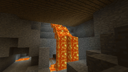 Lava can appear from the form of a lava source to form a lava river, flowing from the cave into the lake.The lava source block can appear on the side of the cave, the canyon, the abandoned mine or the stone cliff above the ground.